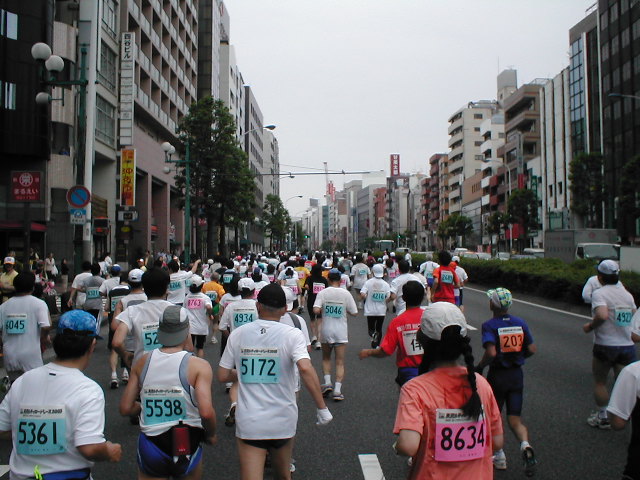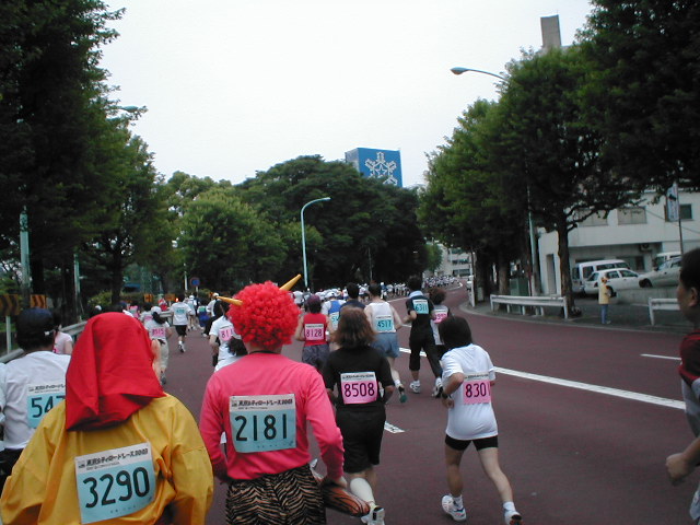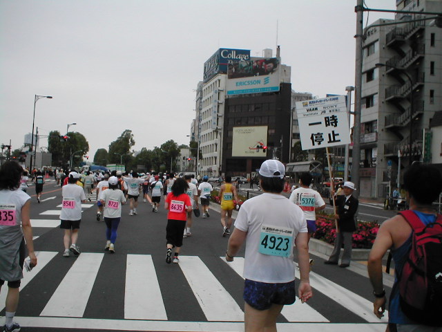 遂に熱烈応援団と遭遇!! このレース最難関?の上り坂。 でも大したことないです。 福の神さん、赤鬼さんと一緒に。 四ッ谷駅前で一時停止。信号待ちでーす。 7キロ 46:19(7:25) 広い道を走れるのは気持ちいい! 有名な人にも会いました。